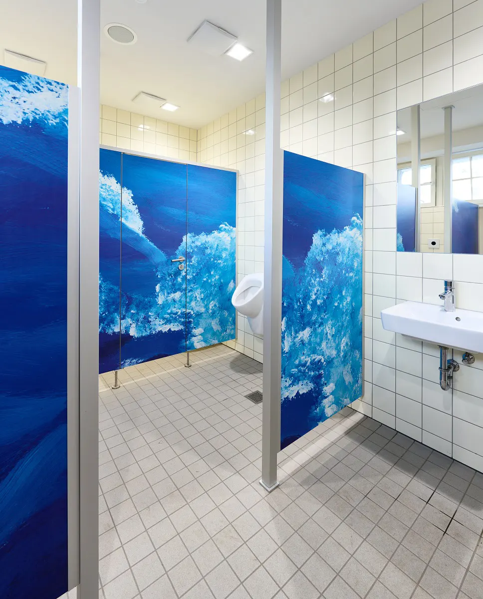 In the course of the extensive renovation work, great importance was also attached to an individual design of the sanitary rooms that matched the educational sector. The WC rooms equipped with EF-3 series WC partitions were provided with large-scale motif prints by various regional artists. This gives the WC facilities a completely individual touch, which is also very well received by the users. It is not only the diverse design possibilities of this WC partition system that make EF-3 an absolute all-rounder, but also its high stability and complete water resistance. EF-3 WC partitions are made of high-quality 36 mm thick sandwich elements with an HPL surface, which makes them particularly robust, waterproof and durable.