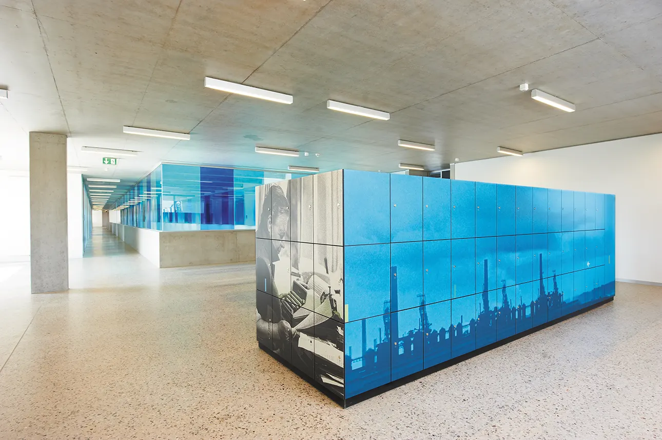 Schäfer lockers and the Lycée Technique Mathias Adam in Belval – that's its own special story. The building contractor, Le Fonds Belval, is developing a seemingly fantastic new city in an industrial wasteland, with outstanding architecture for living and working. When the accompanying school was rebuilt in the southernmost Luxembourg region of Pétange in 2005, the architecture firm Jim Clemes (www.clemes.lu) placed special emphasis on the architectural integration of buildings and facilities with the teaching and learning of the students and teachers within.