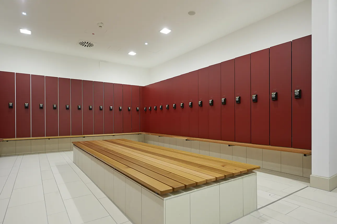 Correspondingly, the lockers GVKF13 on the opposite side in the locker area are decorated in different shades of colour. Lockers and compartments are made of the type GVKF. For the wall panels and around the automatic pay individual solutions were required; even more in the construction of the benches with cushions made of high quality wood.