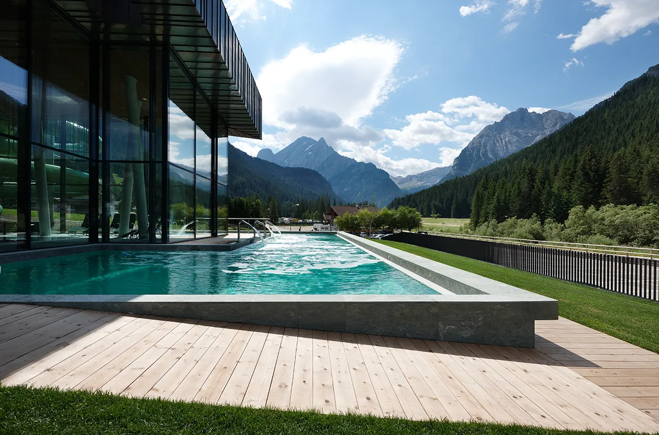 All active-tourists appreciate the recovery of tired muscles in the warm water of a spa bath. With the Aquarena Dòlaondes and the Eghes Wellness Center, Canazei is a luxury example to show that it is possible to design an unique spa area in such an unique mountain area. On 2.400qm the Brixener architect Ralf Dejaco has built a spa area which is split into four thematic zones. Always in view: the vast backdrop of the surrounding Dolomites massifs, including Rose Garden, Sella and Marmolada.