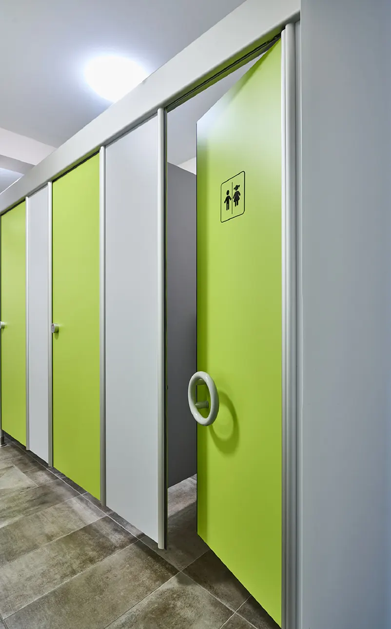 The cubicle unit type VKH13 shows what matters in the sanitary room: attractive appearance, pleasant application function for the user and exemplary cleaning attributes. The suspended construction makes supporting feet largely superfluous. This gives the unit a particularly attractive design. The efficiency in terms of cleaning and maintenance is due to the clearance. Due to the low number of support feet, cleaning can be done quickly and easily. The easy-care material of the unit is also very positive in the cleaning process and remains visually appealing for a long time.