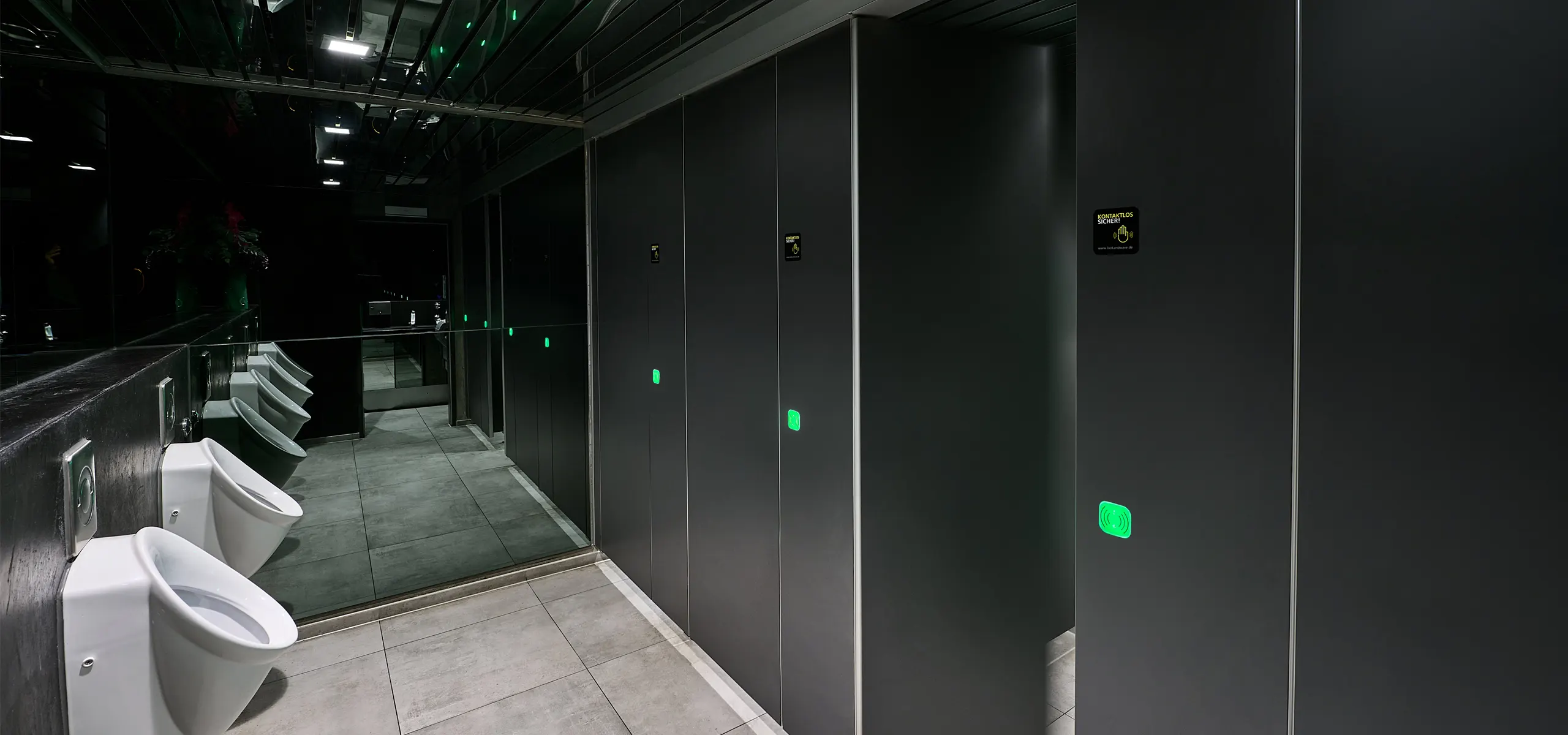 Höchste Ansprüche an Qualität und Komfort ziehen sich wie ein roter Faden durch das gesamte Lokal. Im Zuge der Sanierungsmaßnahmen wurden die Sanitäranlagen im Riva mit berührungslosen WC-Trennwänden aus dem Hause Schäfer ausgestattet. Mit Look&Wave wurde eine Lösung gefunden, die Hygiene optimiert und zugleich außergewöhnlichen Komfort bietet. Look&Wave steht für kontaktloses Öffnen und Schließen der WC-Türen.