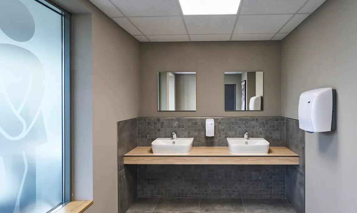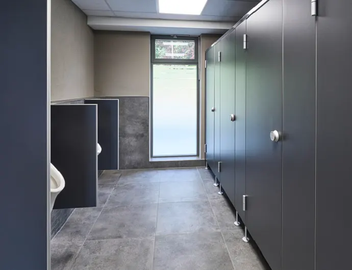 Die neu gestalteten Sanitärräume überzeugen durch Großzügigkeit und harmonisch aufeinander abgestimmte Farben und Materialien. Die verbauten EF-3 WC-Trennwände unterstreichen die stimmige Atmosphäre durch ihr formschönes Design. Flächenbündige Fronten zeichnen diese hochwertige WC-Anlage aus. Die Konstruktion aus 36 mm starken Sandwichelementen mit HPL-Oberfläche lassen die WC-Trennwand nicht nur äußerst robust, sondern auch höchst reinigungsfreundlich daherkommen. Durch ihre Wasserbeständigkeit sind EF-3 WC-Kabinen bestens für den Nassbereich geeignet.