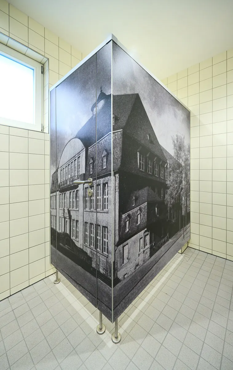 Im Zuge der umfangreichen Sanierungsarbeiten wurde auch viel Wert auf eine individuelle zum Bildungssektor passende Gestaltung der Sanitärräume gelegt. Die mit WC-Trennwänden der Serie EF-3 ausgestatteten WC-Räume wurden mit großflächigen Motivdrucken verschiedener regionaler Künstler versehen. Die WC-Anlagen erhalten dadurch eine völlig individuelle Note, die auch bei den Nutzern sehr gut ankommt. Nicht nur die vielfältigen Gestaltungsmöglichkeiten dieses WC-Trennwandsystems lässt EF-3 zu einem absoluten Allrounder werden, sondern auch seine hohe Stabilität und komplette Wasserfestigkeit. EF-3 WC-Trennwände werden aus hochwertigen 36 mm starken Sandwichelementen mit HPL-Oberfläche gefertigt, was sie besonders robust, wasserfest und langlebig macht.