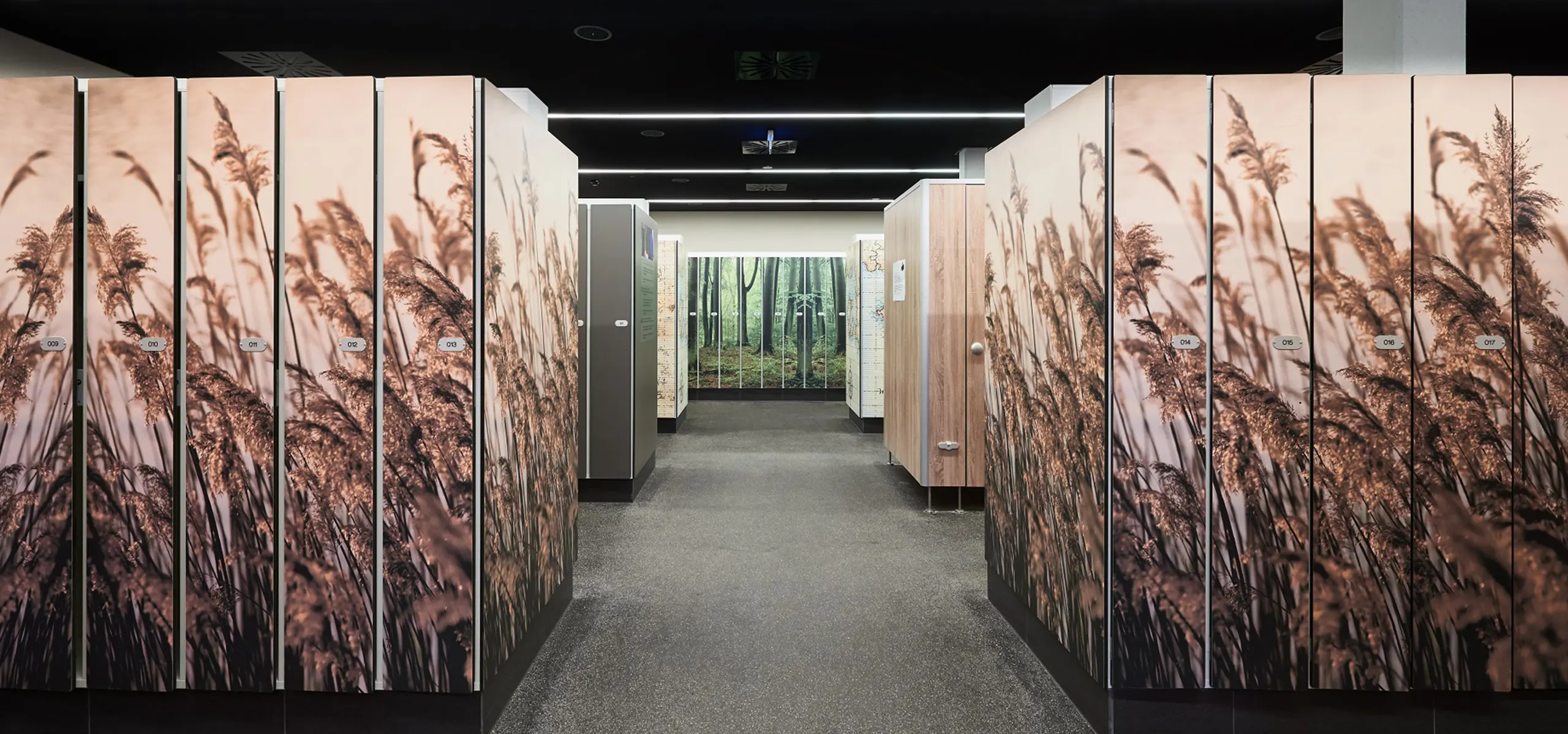 Die Garderobenschrankanlagen bestechen durch ihre ausgefallenen Motivdrucke. Drei verschiedene Aufdrucke prägen das Erscheinungsbild der Umkleideanlagen – Optisch ein absolutes Highlight und zugleich eine ansprechende Orientierungshilfe für die Besucher. Bei der Fertigung der Schränke war Präzision und Erfahrung gefragt, da sich die einzelnen Motivabschnitte über die komplette Länge der Schrankanlage zu einem großen Gesamtbild zusammenfügen.
