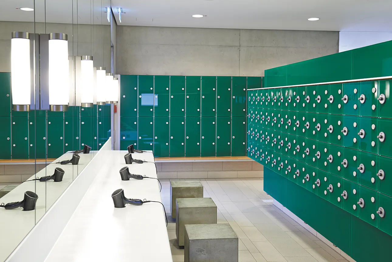 Apropos umkleiden: Der komplette Bereich wurde von Schäfer Trennwandsysteme mit Umkleidekabinen aus Glas des Typs VITRUM WK und Garderobenschränken des Modells VITRUM GS ausgestattet. Ganz bewusst entschieden sich die Planer aufgrund des hochwertigen Materials für diese Lösung. Denn die Themen nachhaltiges Bauen und ein dauerhaft repräsentatives Erscheinungsbild standen ganz oben auf der Agenda. Die verwendeten Farben dienen den Besuchern als Orientierungshilfe und schaffen zugleich ein Gefühl von Weite und Raum. Man fühlt sich einladend empfangen, spürt die angenehme Atmosphäre – und ist sogleich positiv eingestimmt auf einen erlebnisreich-entspannten Aufenthalt im F3.