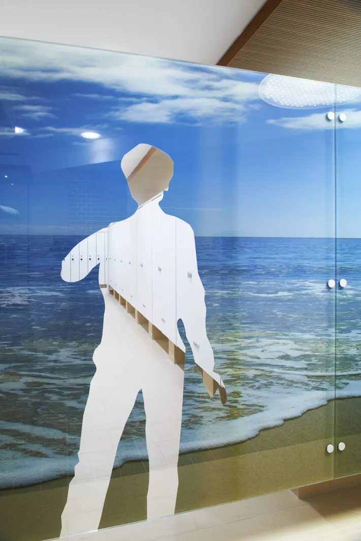 Eine gut 15 m lange Glaswand wurde im Digitaldruckverfahren mit einem Meeres-Motiv versehen und stimmt die Besucher auf das Thermen-Erlebnis ein. Unbedruckte Glasflächen in Form von menschlichen Schattenrissen gewähren Einblicke in die langgestreckten Barfußgänge des Umkleidebereiches sowie auf die reinweißen Umkleidekabinen und Garderobenschränke. Mit diesem optischen Kniff wird die Großzügigkeit des Raumes unterstrichen und die Blicke der Besucher in die Tiefe gelenkt. Daneben hat die Glaswand aber auch noch einen funktionalen Aspekt: Flächenbündig sind die Wertfächer in Teile der Glasfront eingelassen und befinden sich somit im direkten Blickfeld des Kassenpersonals.