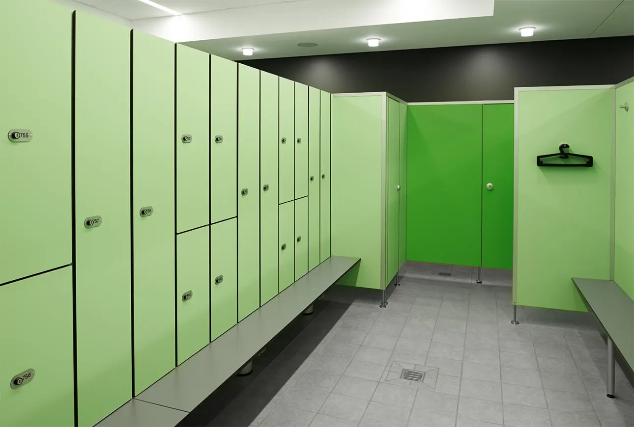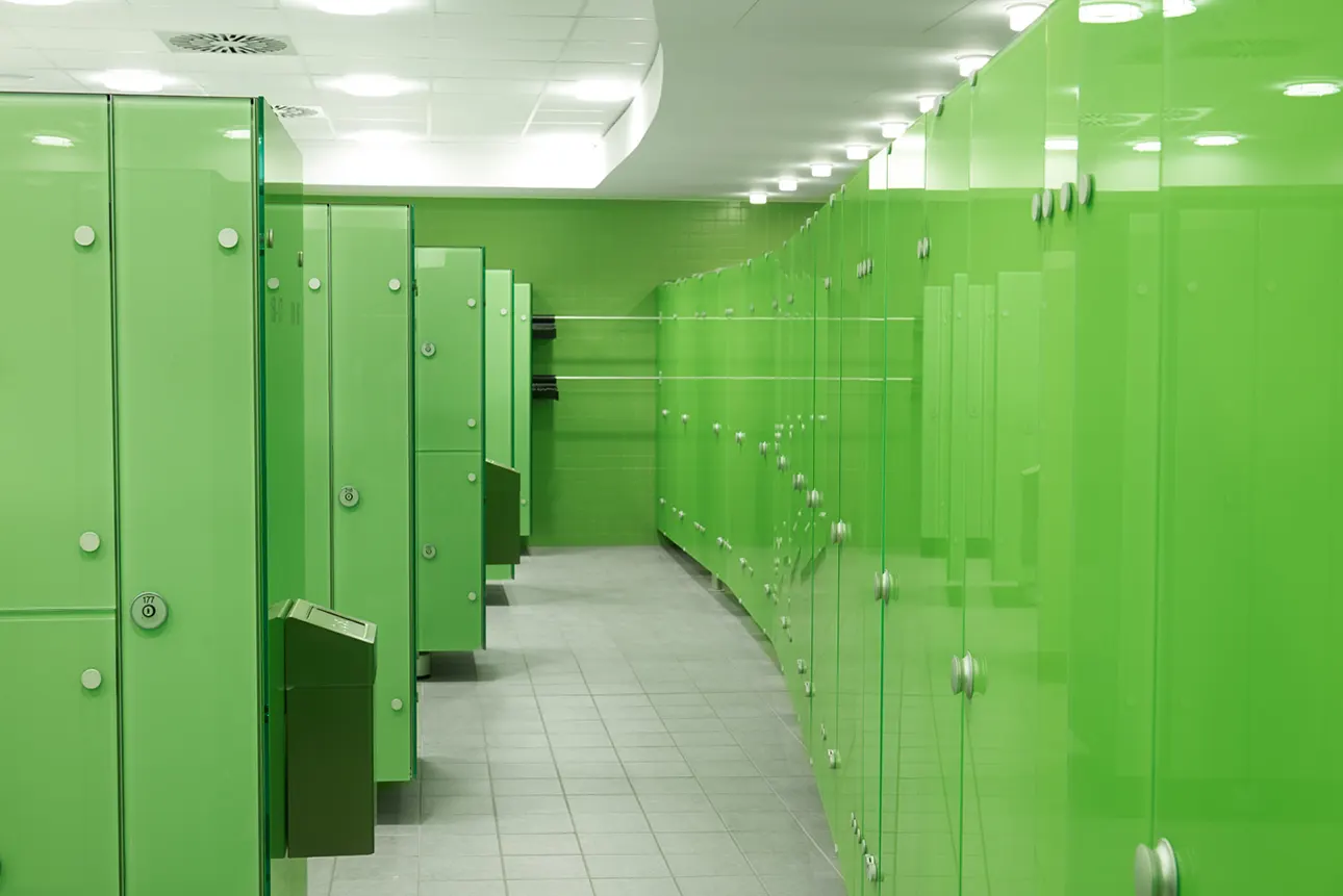 Das Obergeschoss wurde in ähnlicher Weise konstruiert, allerdings mit HPL-Materialien. Hier setzte Schäfer Trennwandsysteme auf flächenbündige Sandwichelemente. Zum Einsatz kamen die Umkleidekabinen des Typs EF-3 WK und Garderobenschränke der Modelle GVKF13.
