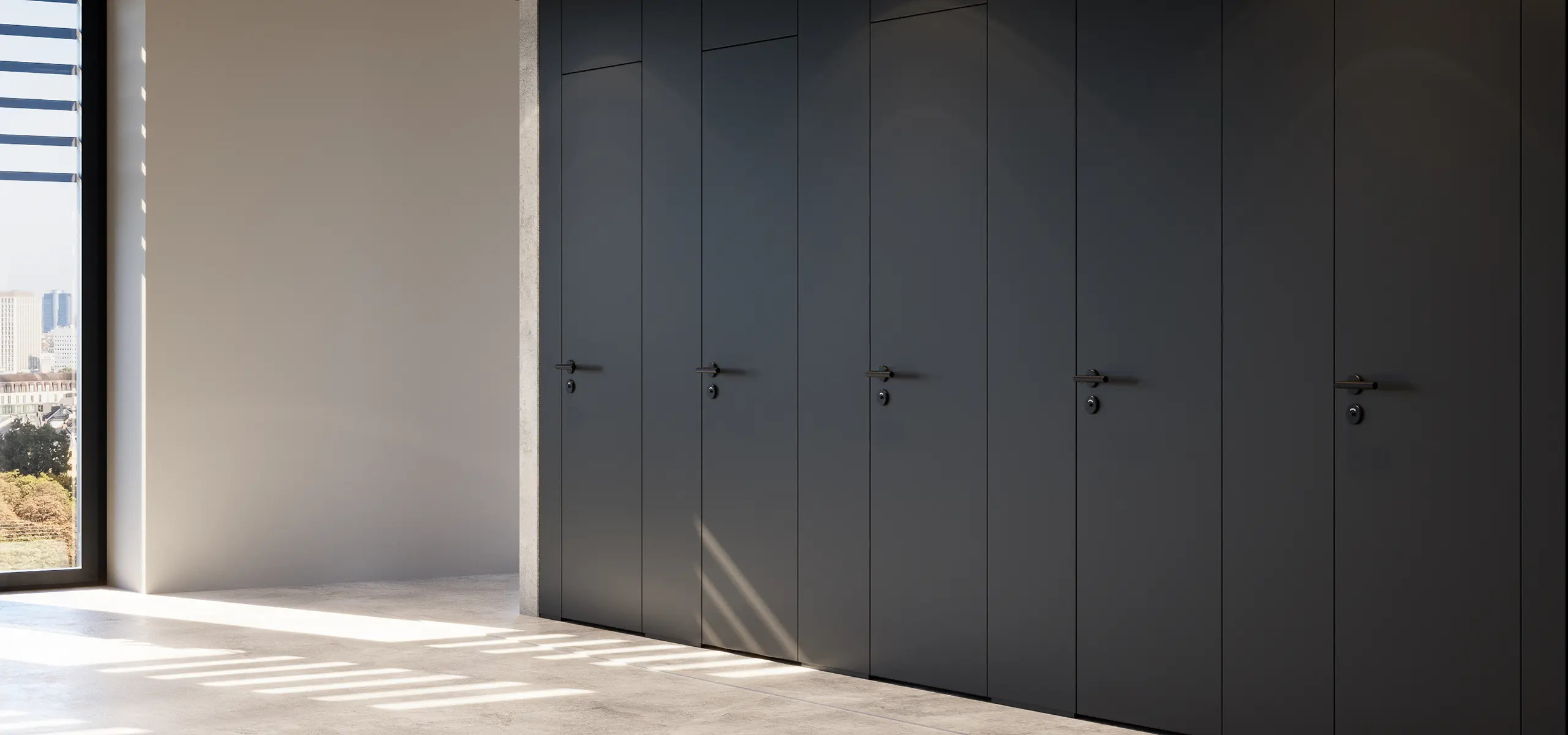 - Auf der Kabinenaußenseite der Sanitärtrennwand absolut flächenbündige Front